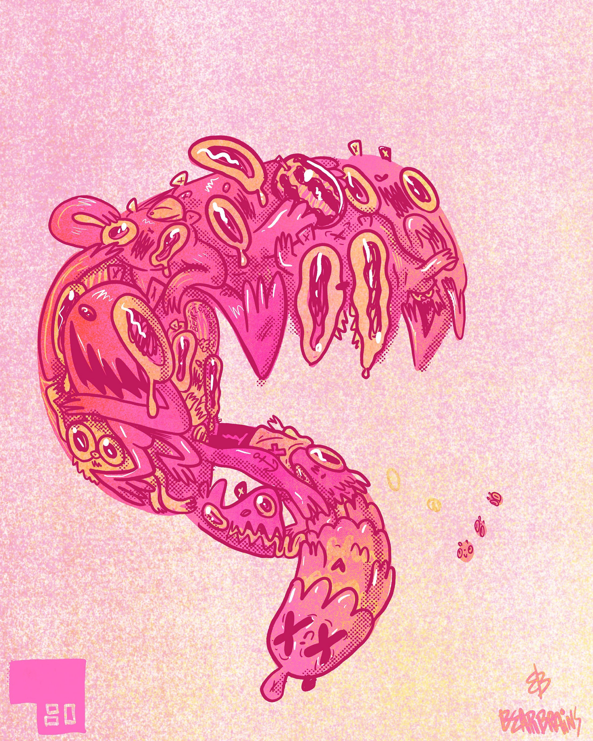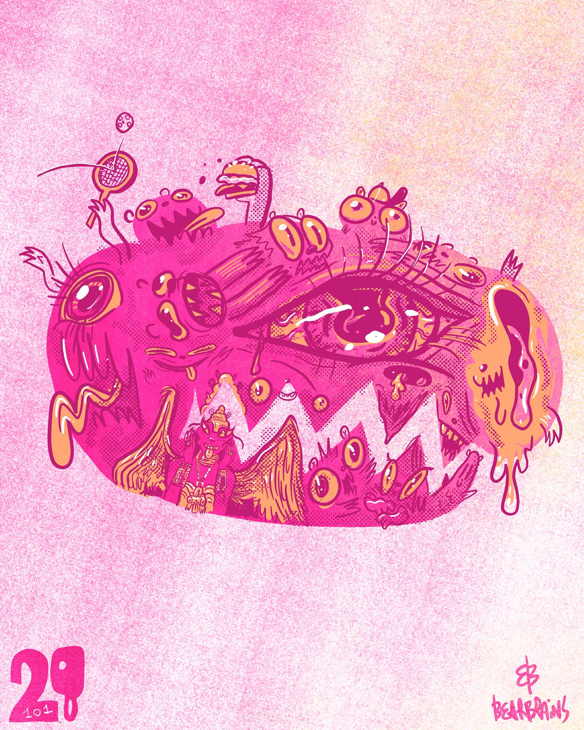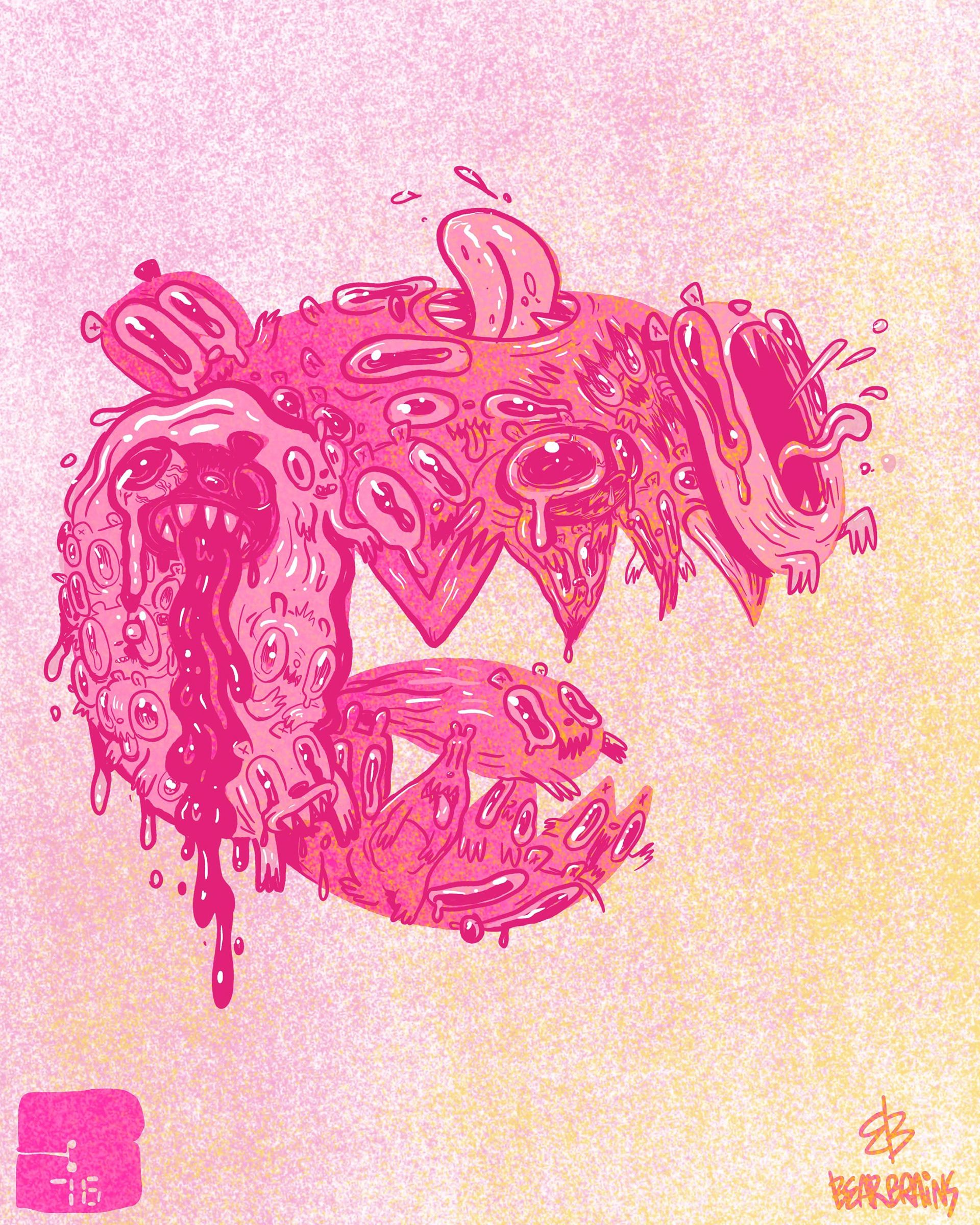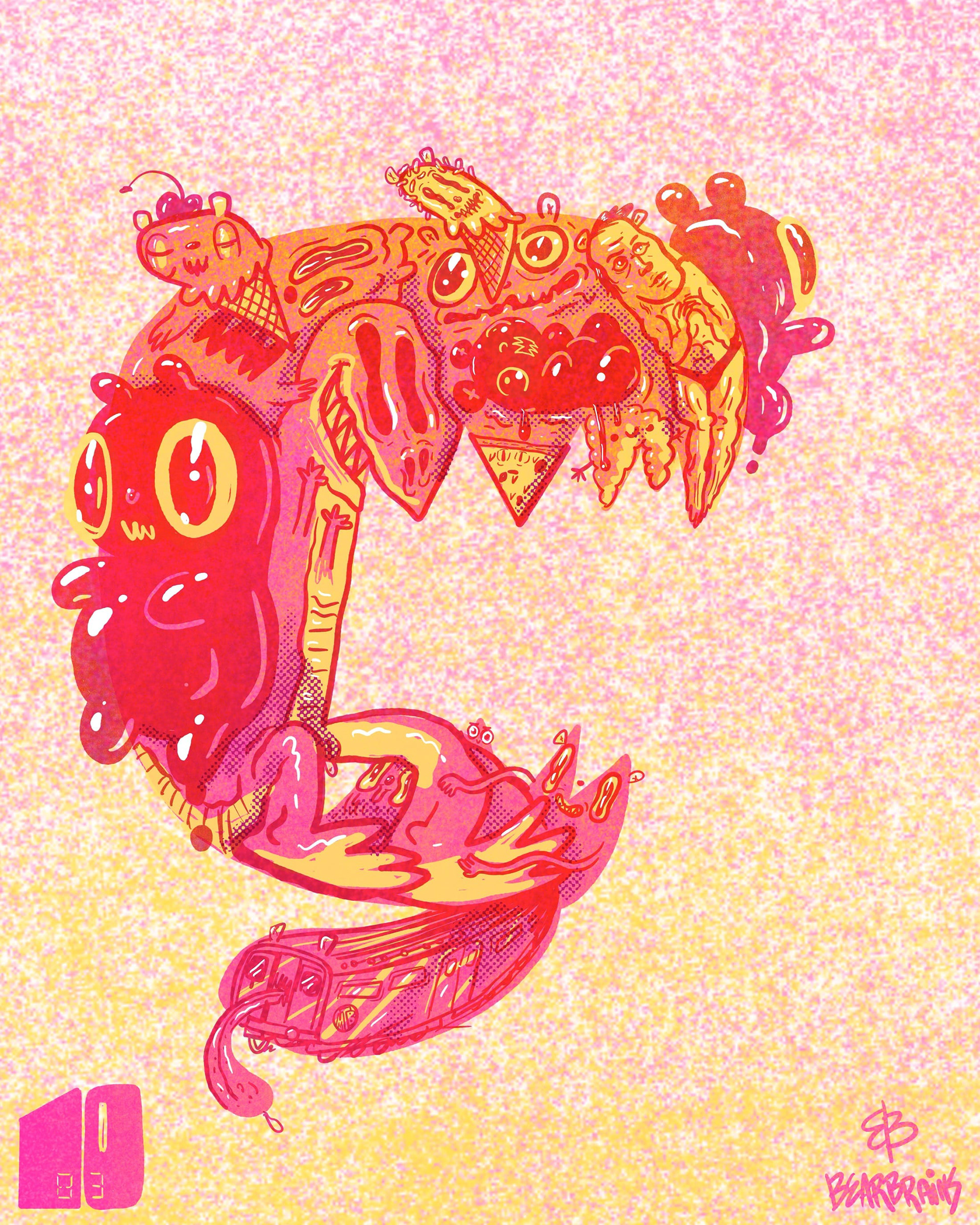 For the rest of the project I just improvised illustration within each blob shape until I covered the whole area. I made some attempt to keep the forms in the eyeball area somewhat cohesive by placing large circular design elements there, like donuts and camera lenses.