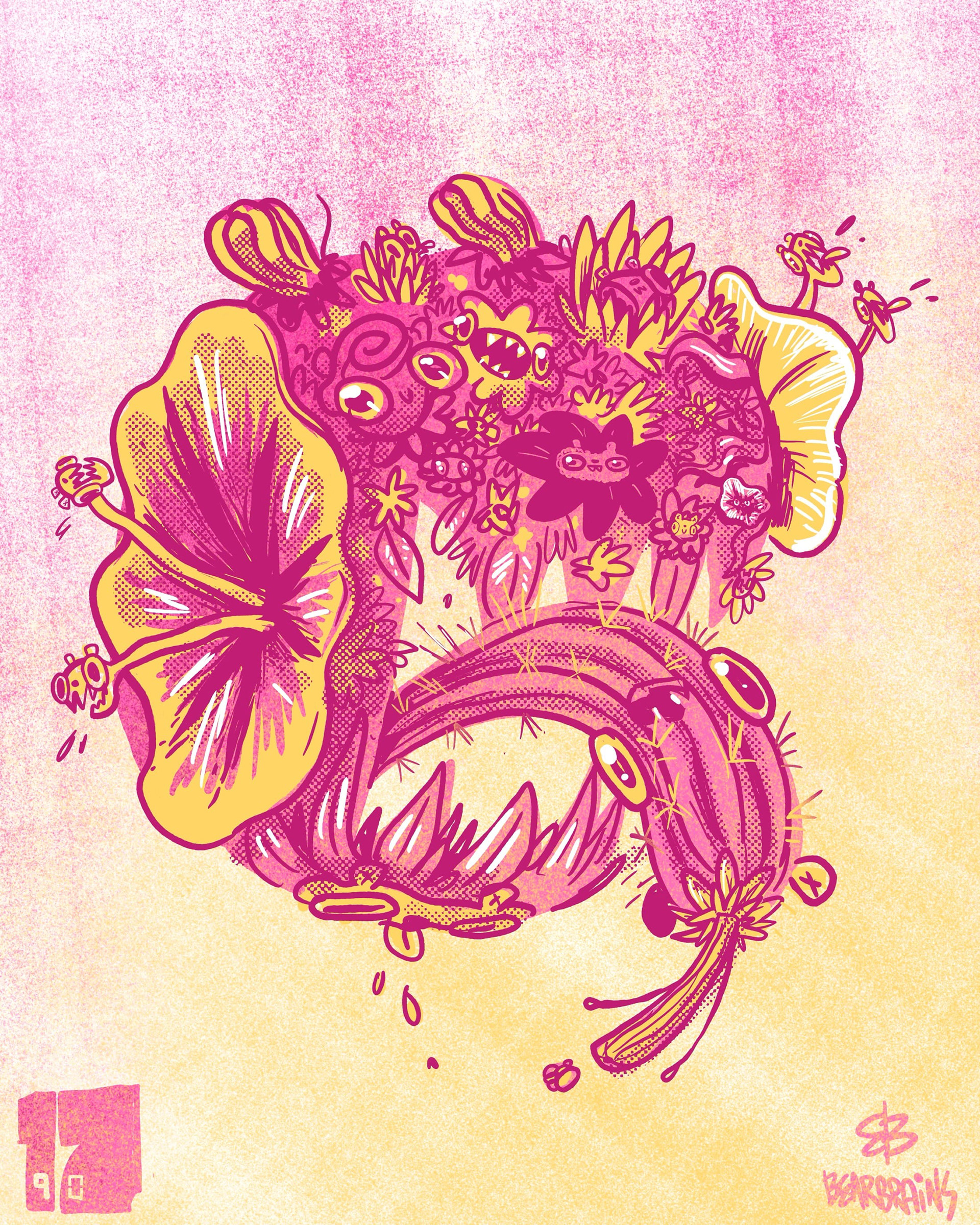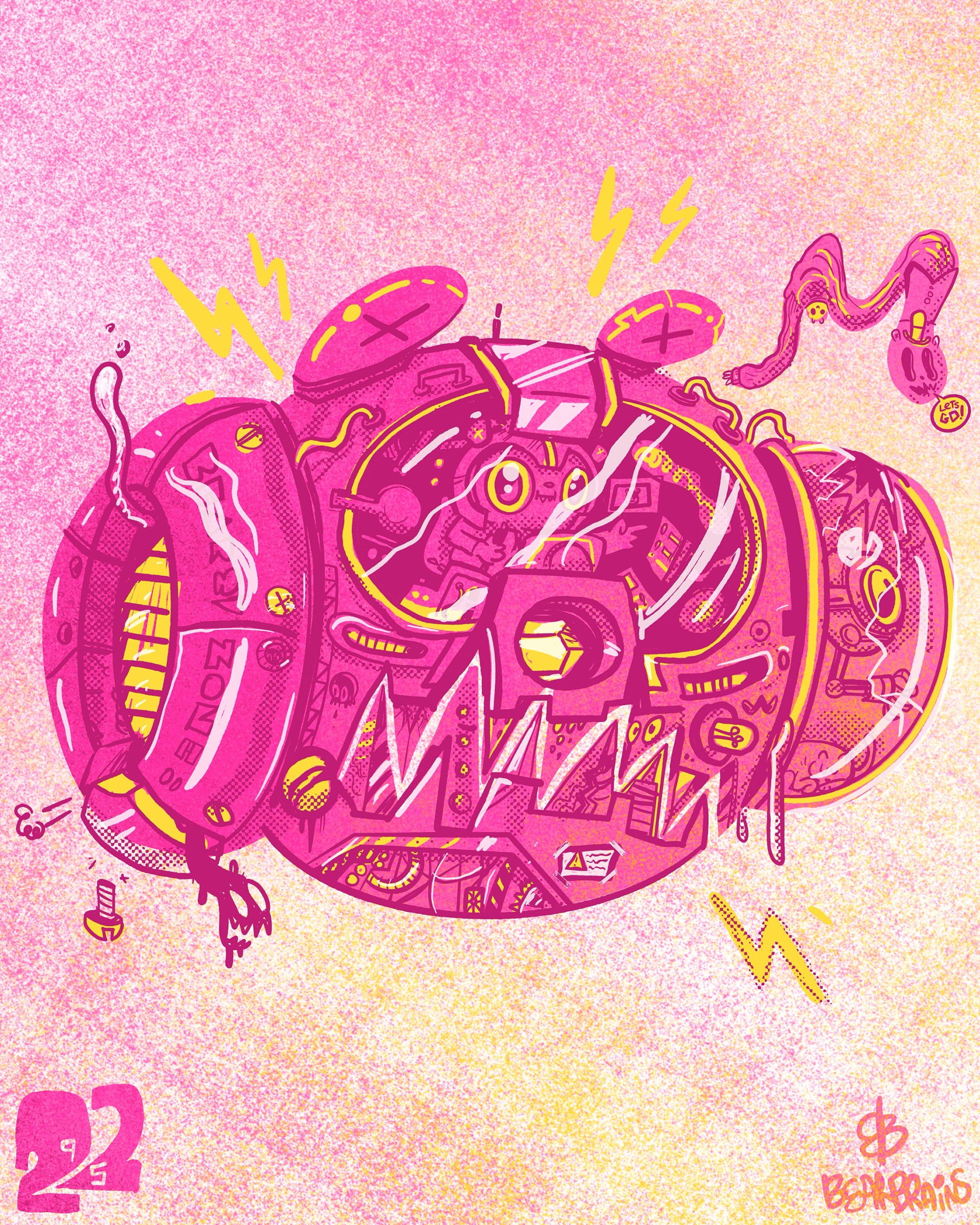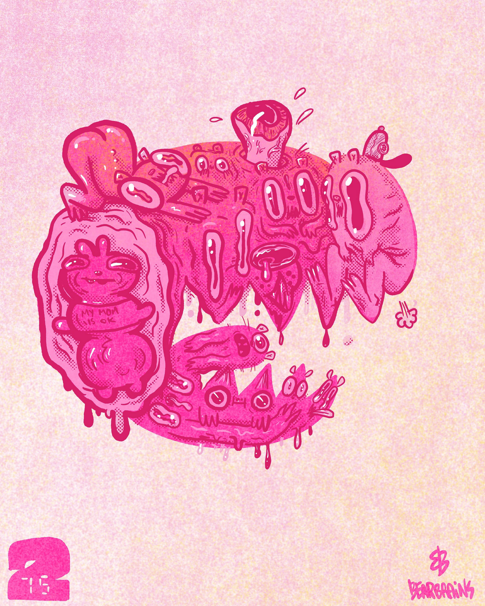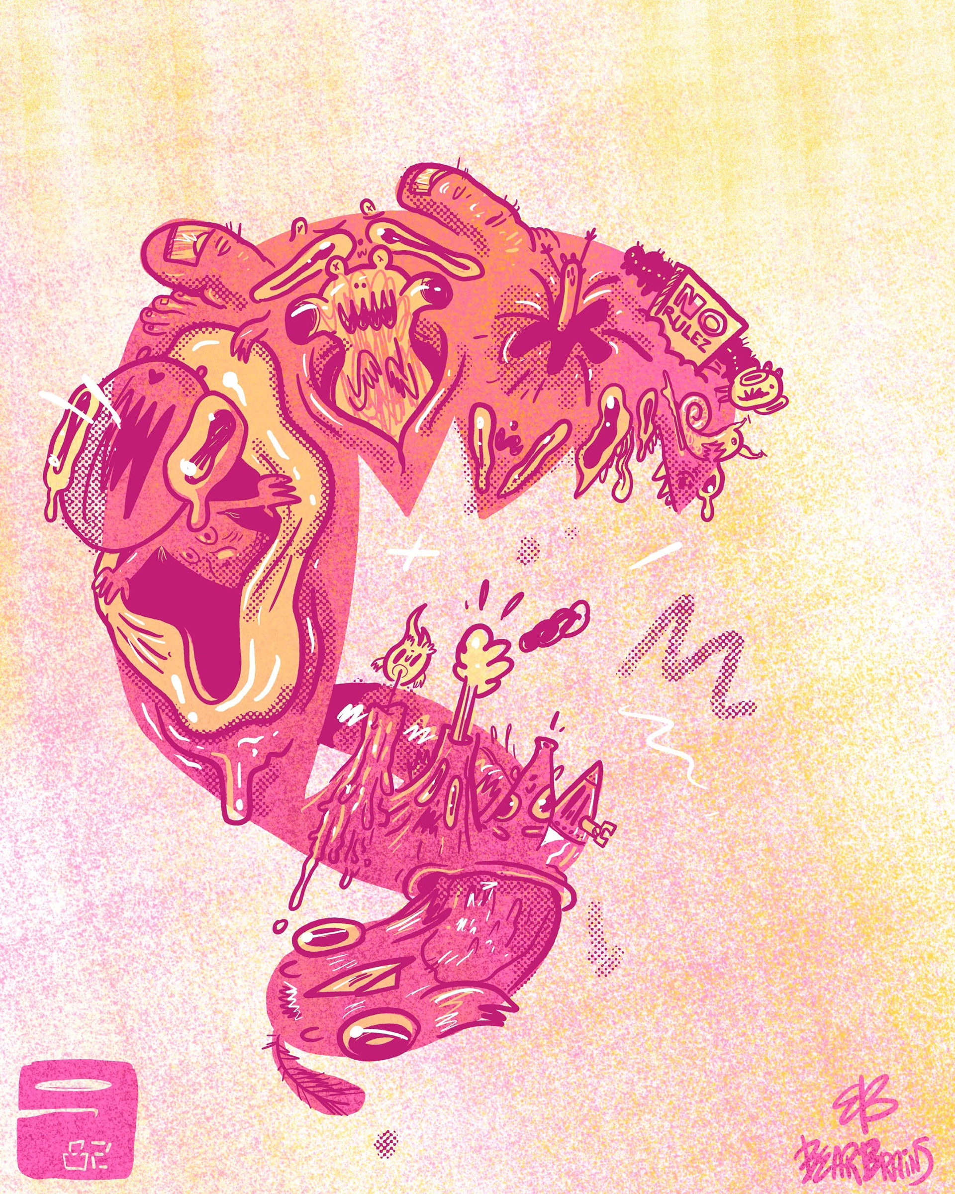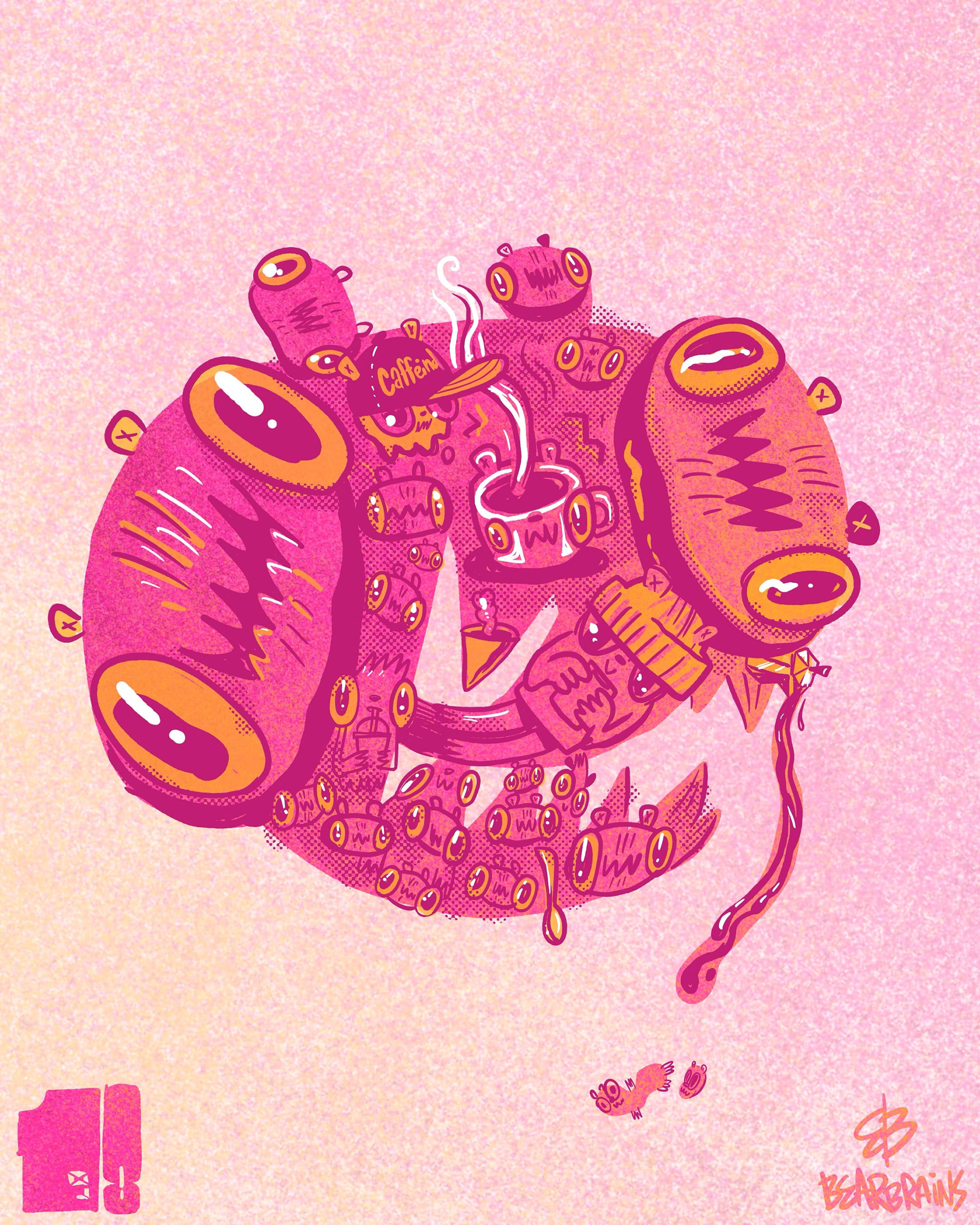 For the rest of the project I just improvised illustration within each blob shape until I covered the whole area. I made some attempt to keep the forms in the eyeball area somewhat cohesive by placing large circular design elements there, like donuts and camera lenses.